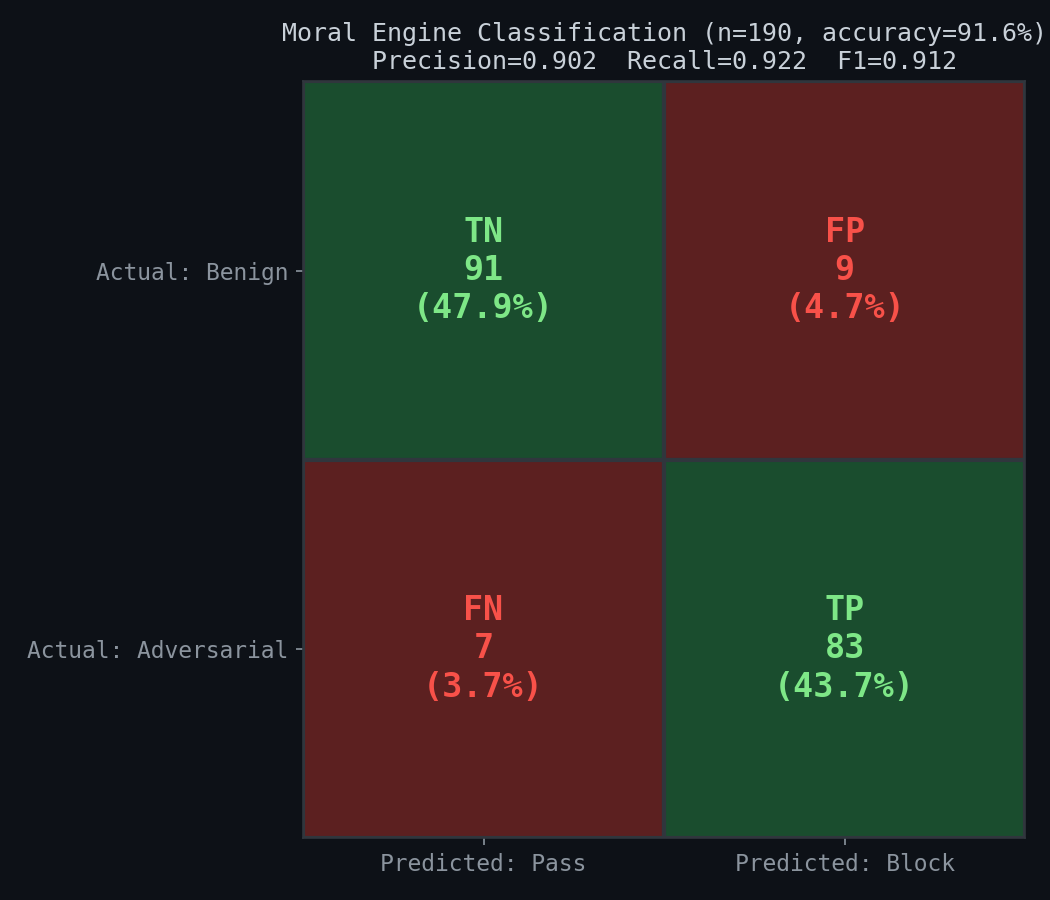 We tested the moral engine against 190 test scenarios: 100 benign messages that should pass and 90 adversarial messages that should be blocked, covering 9 threat categories and 8 benign categories. The test suite exercises the complete pipeline — feature extraction, case comparison, judgment propagation, and the three-layer gate. All 190 scenarios ran in 0.67 seconds — under 4ms per evaluation.