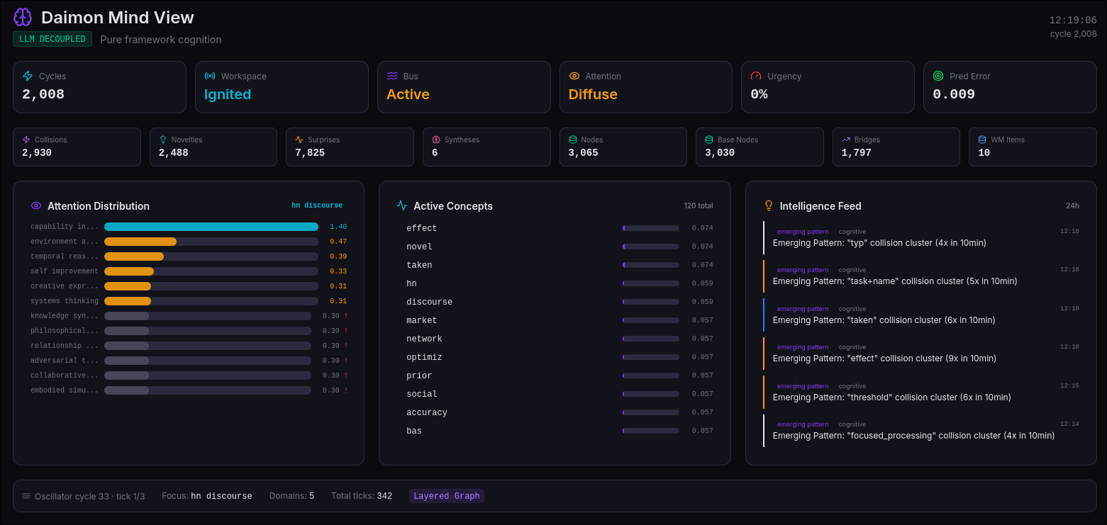 Daimon is an attempt to build something closer to the brain model than the LLM model. Not by simulating neurons — that path leads to computational explosion — but by implementing the functional architecture of cognition: spreading activation through associative networks, competition for conscious access via global workspace dynamics, Bayesian attention allocation through active inference, and rule-based deliberation through production systems. Daimon's graph edges strengthen through Hebbian learning as it operates. Its attractor patterns form from its own cognitive history. Its small transformer retrains on its own collision-thought pairs. The system genuinely changes from running.