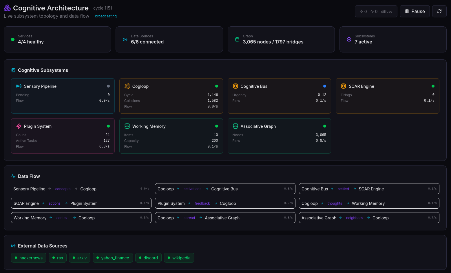 | Cognitive loop | 800ms cycle, 32 simultaneous activation waves |